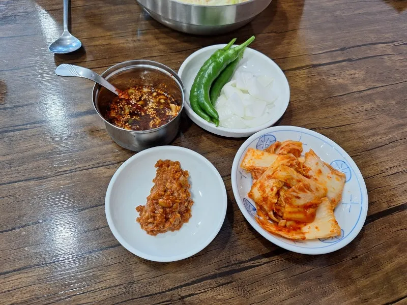 다른 날 방문하였을 때 반찬은 김치와 고추, 양파, 양념장이 나왔는데요.