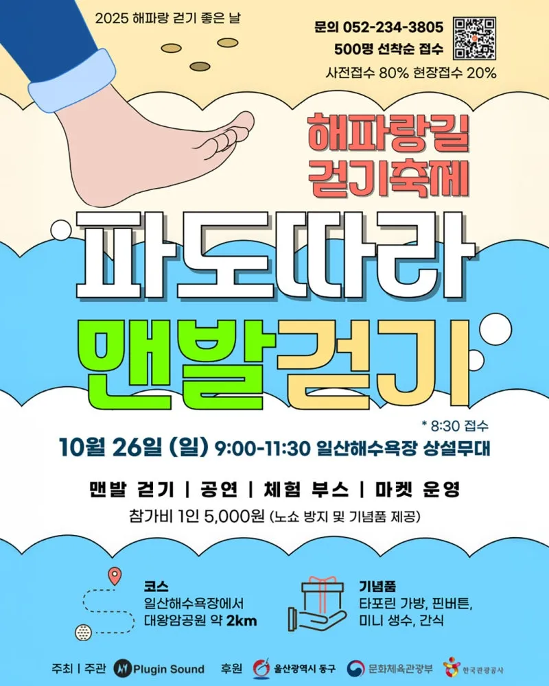 안녕하세요. 플러그인사운드입니다. 해파랑길 걷기축제 "파도따라 맨발걷기" 에 참가 신청해주셔서 감사합니다. 참가 신청 후 입금 안내 문자가 발송될 예정입니다. 최종 입금 확인까지 진행되어야 확정이 됩니다! 문의 : 052-234-3805 해파랑길 함께걷길 - 10월 26일 (일) 09:00 ~ 11:30 (접수 : 08시30분 시작) - 일산해수욕장 상설무대 - 참가비 : 1인 5,000원 (기념품 제공 - 가방, 핀버튼, 생수, 간식) - 준비물 : 편한 복장, 텀블러 등
