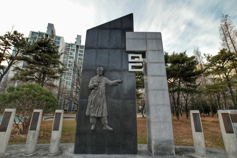 이윤재 선생의 조형물 주위에 세워진 추모비를 보면