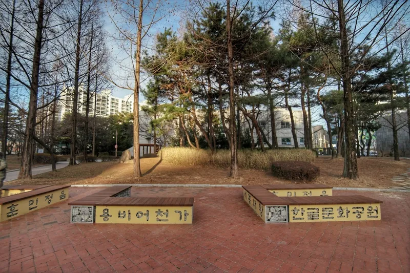 훈민정음, 용비어천가, 한글문화공원이라는 글자가 새겨진 긴 의자에서 바라본 주변 풍경은