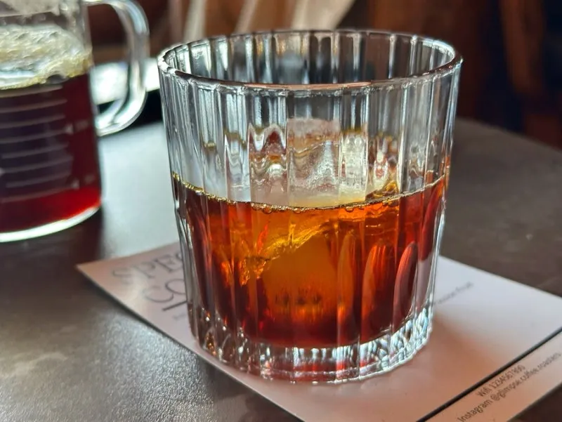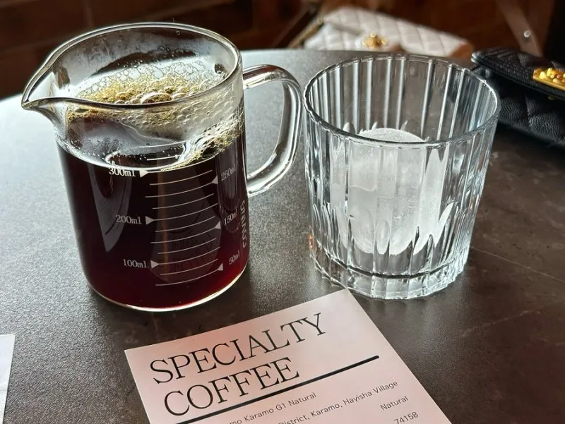 핸드드립 커피로 에티오피아 시다모 카라모 G1 내추럴을 선택했어요. 얼음이 들어간 잔과 드립 커피를 따로 주셔서 알아서 농도 조절하기 좋았네요.