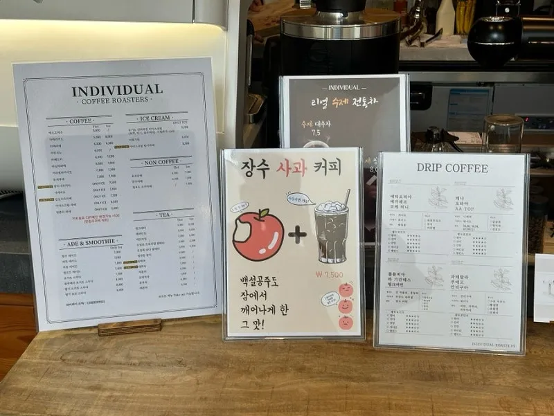 임실 옥정호 카페 인디비주얼은 핸드드립 커피뿐만 아니라 장수 사과 커피처럼 색다른 커피도 준비해 놓았어요.
