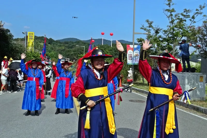 진상 행렬은 많은 분이 함께 참여하는 행사입니다. 옥천골 취타대가 시작을 알리는 풍악이 우렁차고 만장 행렬이 뒤를 잇습니다. 만장 행렬 틈에 테마파크 캐릭터와 다문화 가족의 참여가 특별하게 보였습니다.