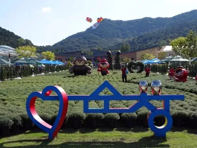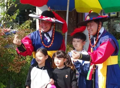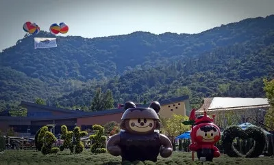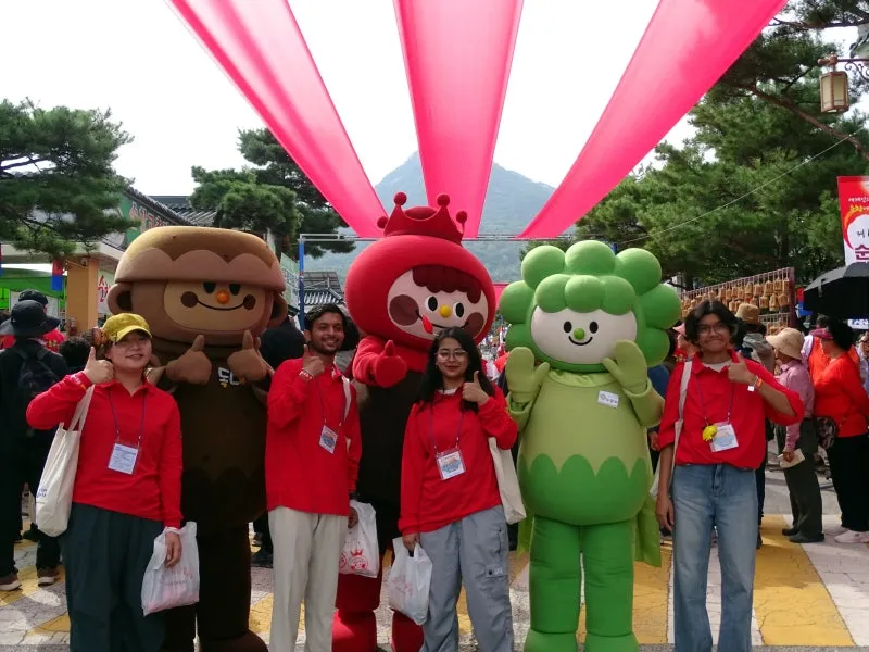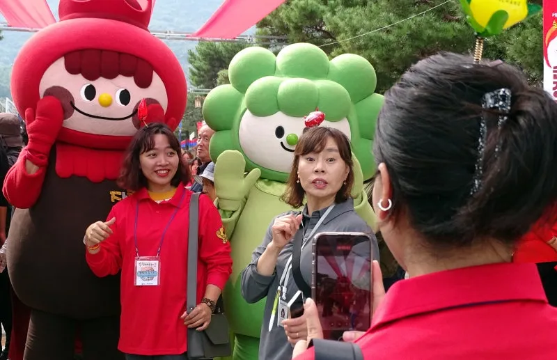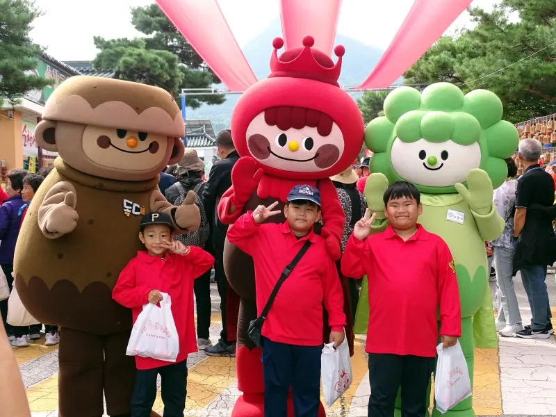 장류체험과 발효 나라 방문 기념행사 후 테마파크의 캐릭터들과 기념촬영 모습이 보기 좋습니다. 관광객이 순창 장류 축제 방문에 즐거워하시며 꽤 만족하신 모습들이십니다.