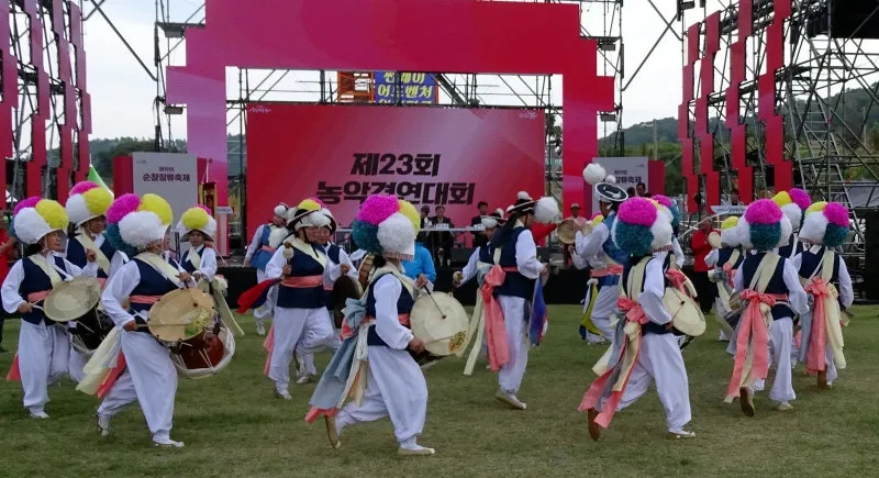 축제 세 번째 날 아침, 순창군의 읍과 면에서 11개 농악팀의 농악 경연대회는 장류 축제 진미 중의 하나입니다. 모두 장단에 맞추어 들썩들썩하며 '얼씨구, 잘한다' 같이들 마음껏 즐기셨습니다.