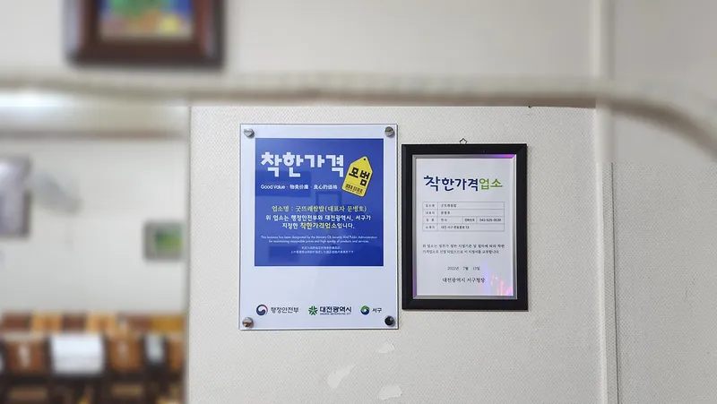 굿뜨래쌈밥삼계탕은 행정안전부와 대전광역시, 서구가 지정한 '착한 가격업소'입니다. 착한 가격업소란? 합리적인 가격에 좋은 상품과 서비스를 제공하는 업소를 말하는데요.