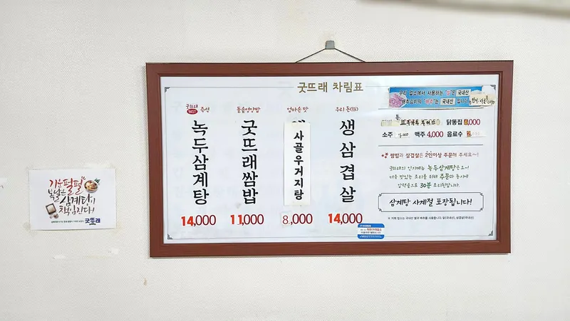 주요 메뉴는 녹두삼계탕과 굿뜨래쌈밥, 사골우거지탕, 생삼겹살입니다. 녹두삼계탕은 14,000원, 굿뜨래쌈밥은 11,000원, 사골우거지탕은 8,000원, 생삼겹살은 14,000원입니다.