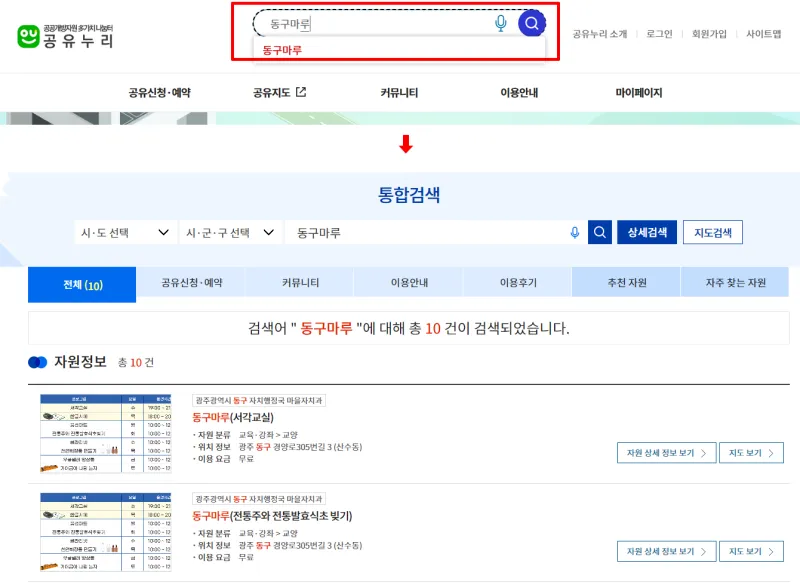 (우측상단)로그인 → (검색창)동구마루 → 프로그램 선택