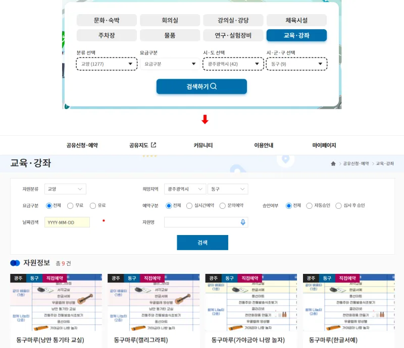 (우측상단)로그인 → (메인페이지) 조건검색 [교육·강좌 / 교양 / 광주광역시 / 동구]→ 검색하기 → 프로그램 선택