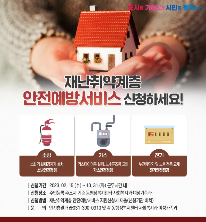 재난으로부터 안전한 군포시가 되기 위해 재난취약계층을 위한 안전예방 서비스를 실시합니다! 이번 안전예방 서비스에서는 노후된 전기시설 교체나 누전차단기 점검, 가스타이머콕 설치와 소방안전점검 등 다양한 부분을 지원할 예정인데요. 안전점검과 정비를 받고 싶은 군포시민이라면 주저 말고 신청해 주세요! ✧*.◟(ˊᗨˋ)◞.*✧