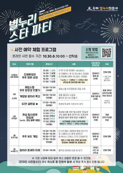 - 동해시청소년시설 홈페이지(https://www.dh.go.kr/dhyc/index.do) → 별누리천문대 예약