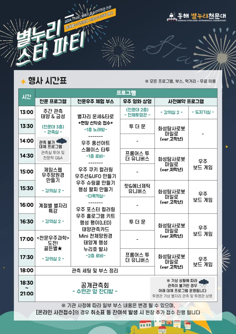 - 일부 사전예약이 필요한 프로그램 외 모든 프로그램, 관측, 부스는 현장에서 자유롭게 이용 가능