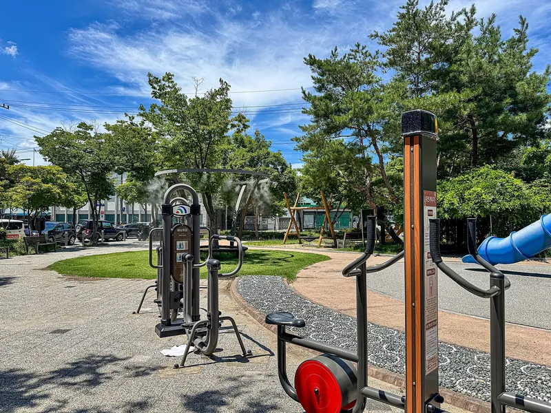자연 그대로의 색감을 살린 목재 놀이터는 아이들에게는 모험심을, 어른들에게는 따뜻한 향수를 불러일으키는 공간입니다. 놀이터 옆으로는 운동 기구와 지압 보도도 설치되어 있어 어르신이나 부모님들도 가볍게 몸을 풀며 휴식할 수 있는 공간으로 활용되고 있답니다.