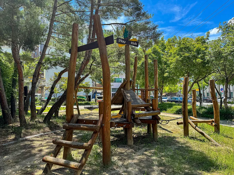 공원 한가운데 자리한 원목 놀이터는 자연 속에 조화롭게 스며든 디자인이 인상적이었습니다. 나무와 나무 사이를 오르내리며 아이들만의 상상력을 펼치기엔 딱 좋은 구조라고 생각됩니다.