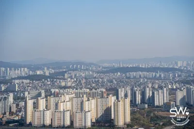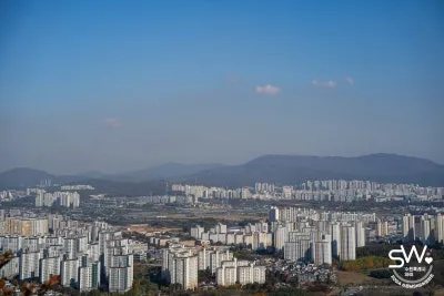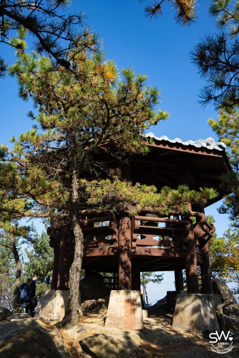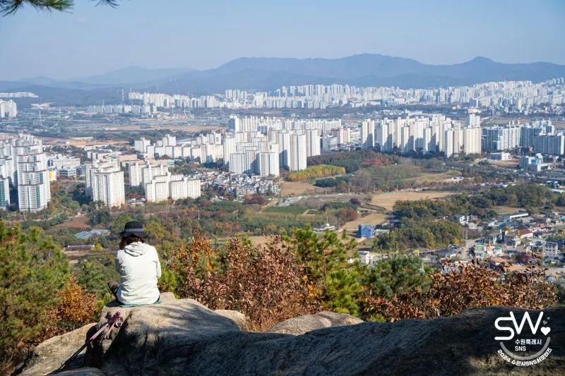 조금 더 안쪽으로 가보면 나무 정자와 함께 또 다른 전망대가 나타납니다. 조망 방향은 수원 호매실 방향으로 아까보다 더 많은 빌딩을 볼 수 있습니다.