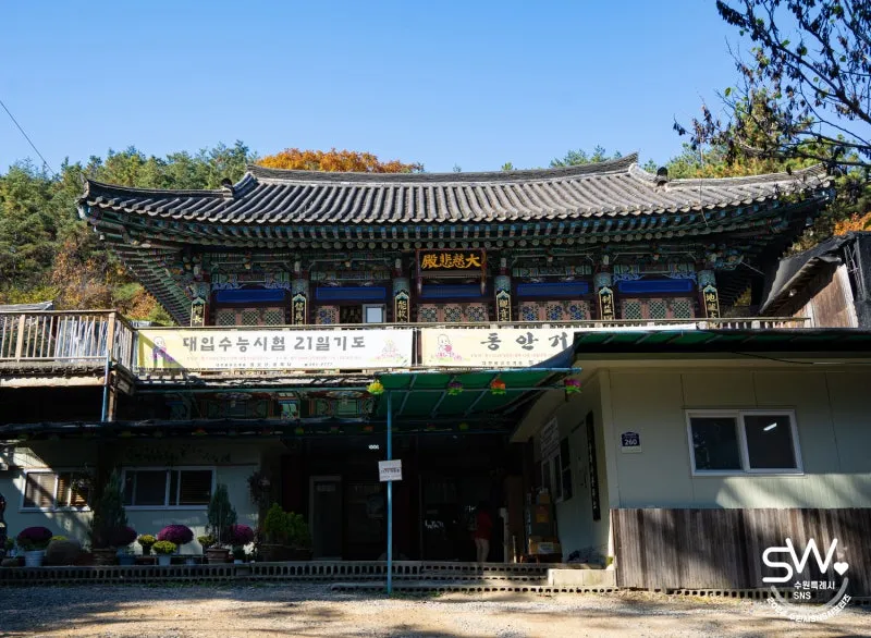 용화산 앞에 구멍이 뚫린 천장이 보이는데 위쪽 우물에서 바로 물을 퍼 올 수 있는 구조입니다. 고즈넉한 칠보산에 위치한 용화사 분위기가 더욱 인상적이었습니다.