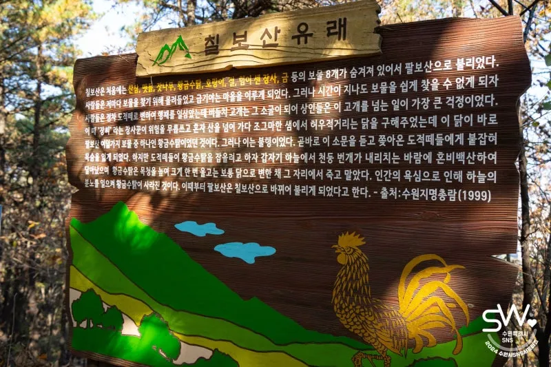 칠보산은 산삼, 맷돌, 잣나무, 황금 수탉, 호랑이, 사찰, 장사, 금 등 8개 보물이 숨겨져 팔보산으로 불렸다가 도적떼에 의해 황금 수탉이 죽어서 칠보산이 되었다는 전설이 있다고 합니다.