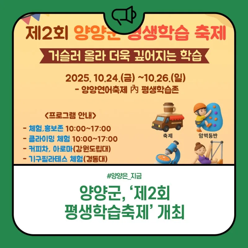 이번 축제는 지역 대표축제인 양양연어축제와 연계해 방문객 참여를 확대하고, 지역 학습공동체의 성과를 군민과 공유하는 장으로 마련됩니다.