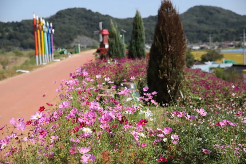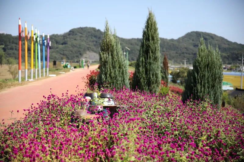 다양한 꽃들과 조형물이 있는 산책하기 좋은 함안 악양둑방