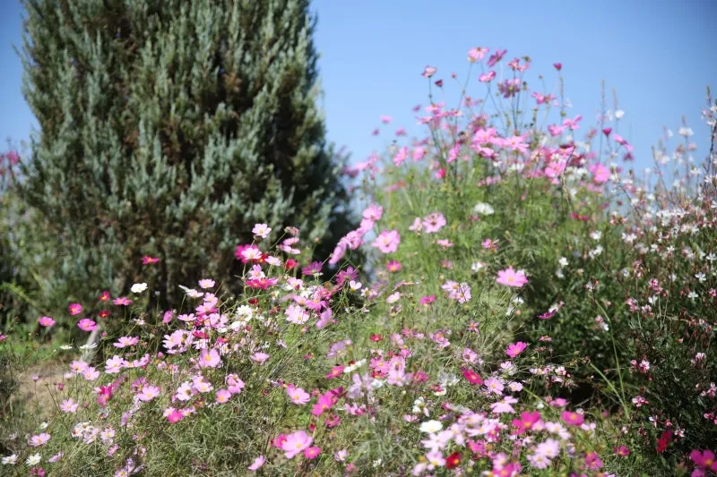 가우라꽃 옆에는 다양한 컬러의 코스모스가 피어 있어요.
