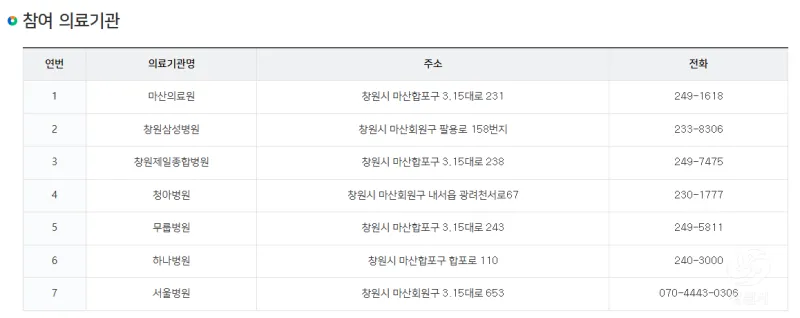 어르신 인공관절 수술비 지원사업은 창원시 마산합포구에 있는 인공관절수술을 하는 모든 병원에서 가능한 것은 아닙니다. 위 표는 ‘어르신 인공관절 수술비 지원사업 참여 의료기관’입니다.