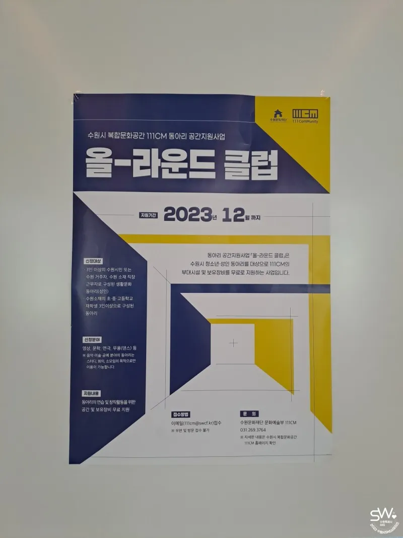 복합문화공간 111CM에서는 '올-라운드 클럽' 동아리 공간지원사업도 운영하고 있습니다. 영상, 문학, 연극, 무용(댄스) 분야에서 활동하는 수원시 청소년, 성인 동아리를 대상으로 111CM의 부대시설 및 보유 장비를 무료로 지원하는 사업입니다.