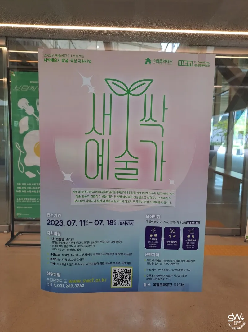 NEWS 2023년 예술공간 111 프로젝트 - ‘새싹예술가’ 발굴·육성 지원사업 공고 2023.06.22 2023년 복합문화공간 111CM 주요시설(전시실, 라운지) 대관 최종 선정 공고 2023.05.19 2023년 111CM 동아리 공간지원사업 「올-라운드 클럽」 모집 공고 2023.05.02 운영시간 화~일요일 | 10:00 - 18:00 ※ 휴관일 : 매주 월요일, 명절연휴, 법정공휴일 ※ 행사 운영에 따라 관람시간은 변경될 수 있습니다. 관람료 : 무료 수원시 복합문화공간 111CM 100m 확대 축소 초기화 About ...