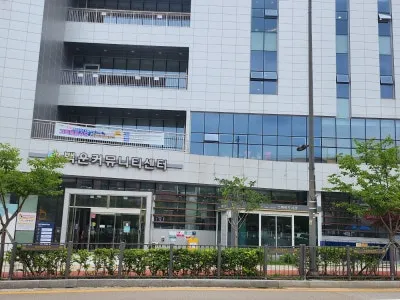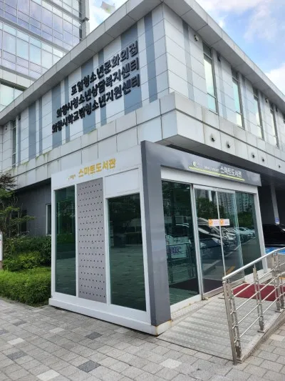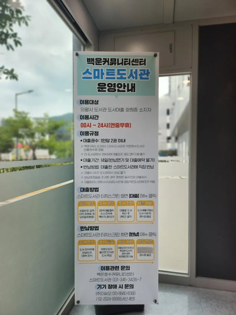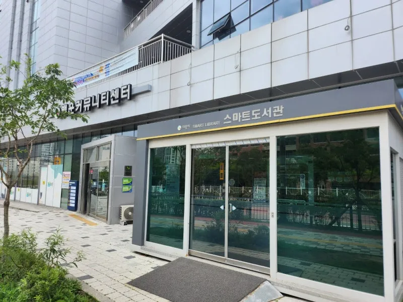 백운호수 스마트도서관은 백운커뮤니티 센터 앞에 위치해 있는데요 커뮤니티센터 입구 오른쪽에 스마트도서관 부스가 보입니다.