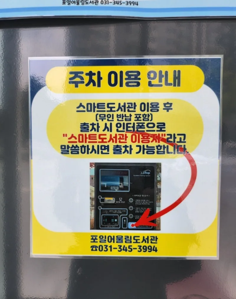 ③스마트도서관 이용 후 (무인 반납 포함) 출차 시 인터폰으로 “스마트도서관 이용자”라고 말씀하시면 출차 가능합니다.