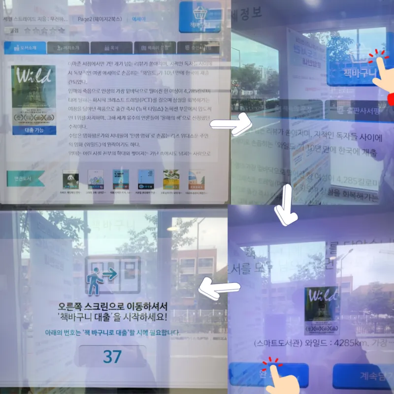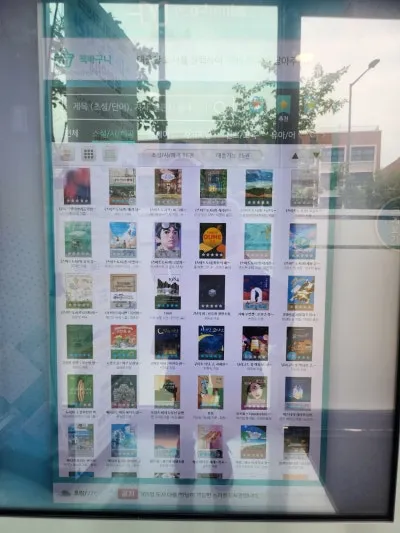 스마트도서관 왼쪽 끝에 터치스크린이 있는 기계에서 원하는 책을 먼저 선택합니다.