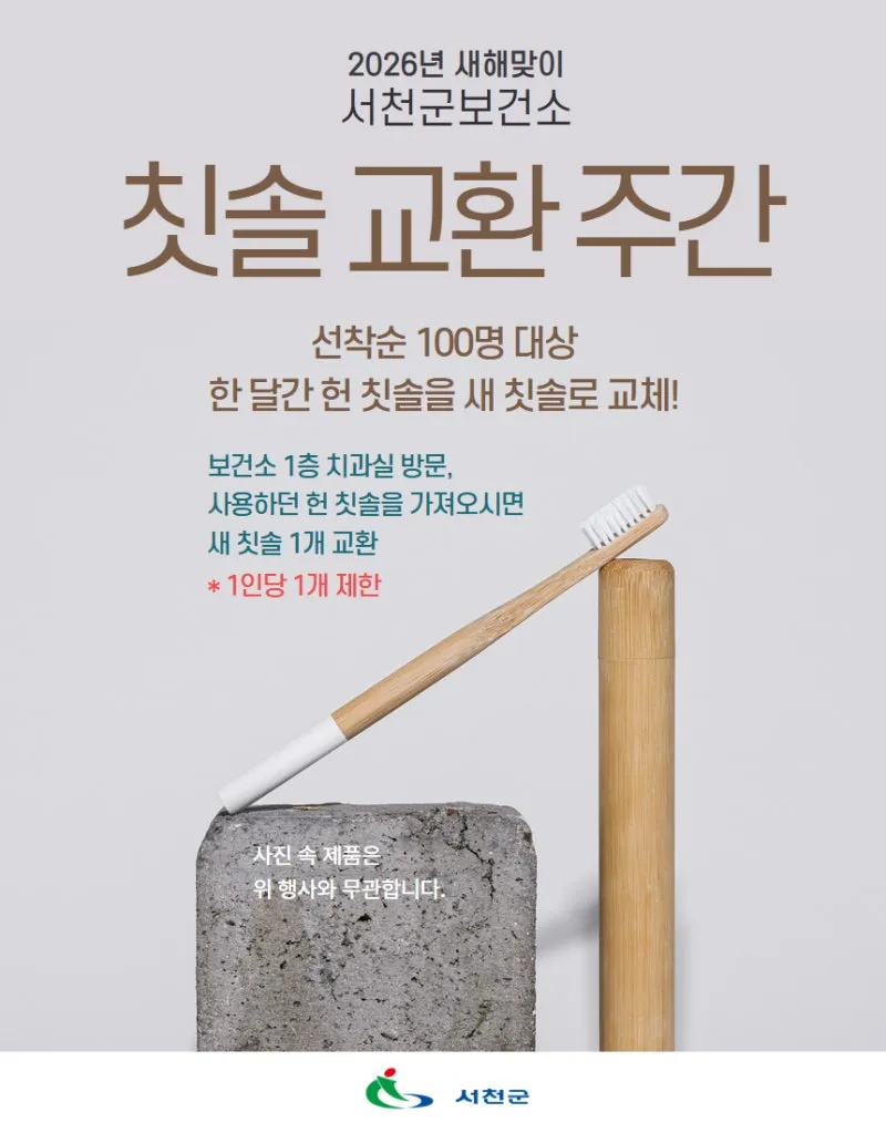 서천군보건소가 2026년 새해를 맞아 군민들의 🦷올바른 구강관리 습관 형성을 위해 ‘칫솔 교환 주간’을 한 달간 운영합니다. 🎉