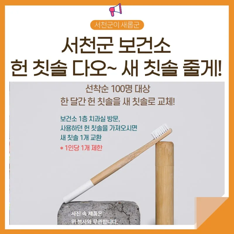이번 행사는 선착순 100명을 대상으로 진행되며, 참여를 원하는 군민은 🏥보건소 1층 치과실을 방문해 사용하던 헌 칫솔 1개를 제출하면 새 칫솔 1개로 교환할 수 있습니다.