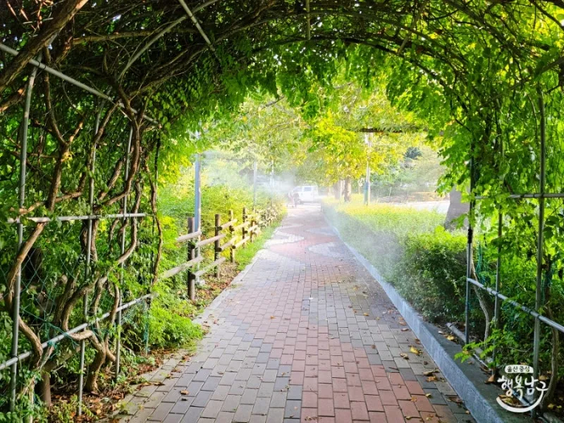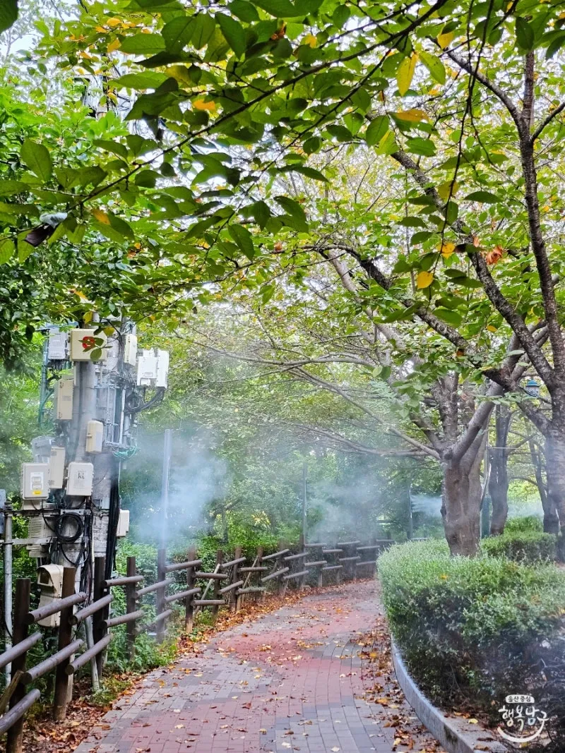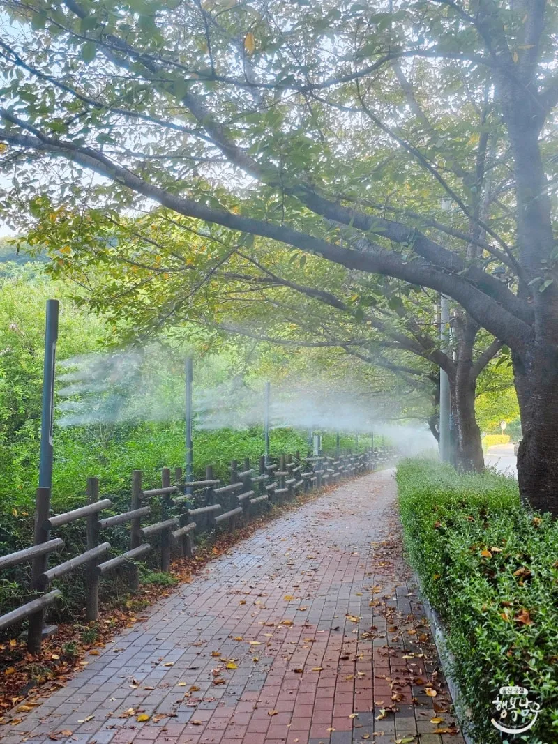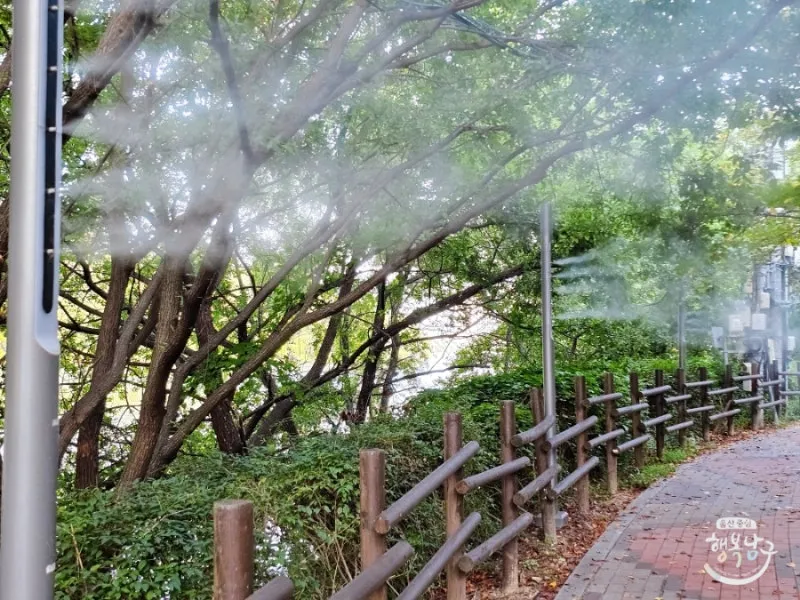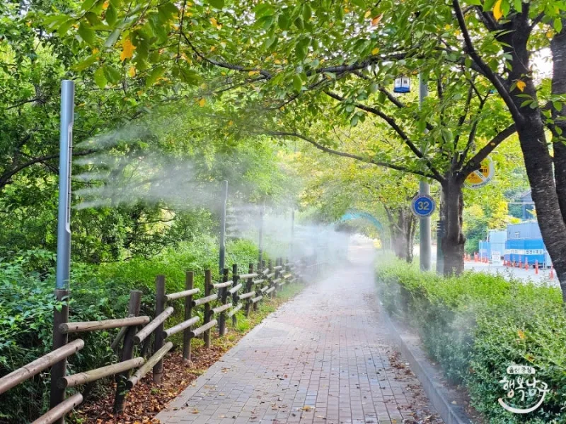 쿨링 포그 시스템은 인공 안개를 만들어 주변 온도를 낮추는 설비에요. 음이온 발생과 공기 정화에도 좋다니 이처럼 좋은 산책로가 있을까요?