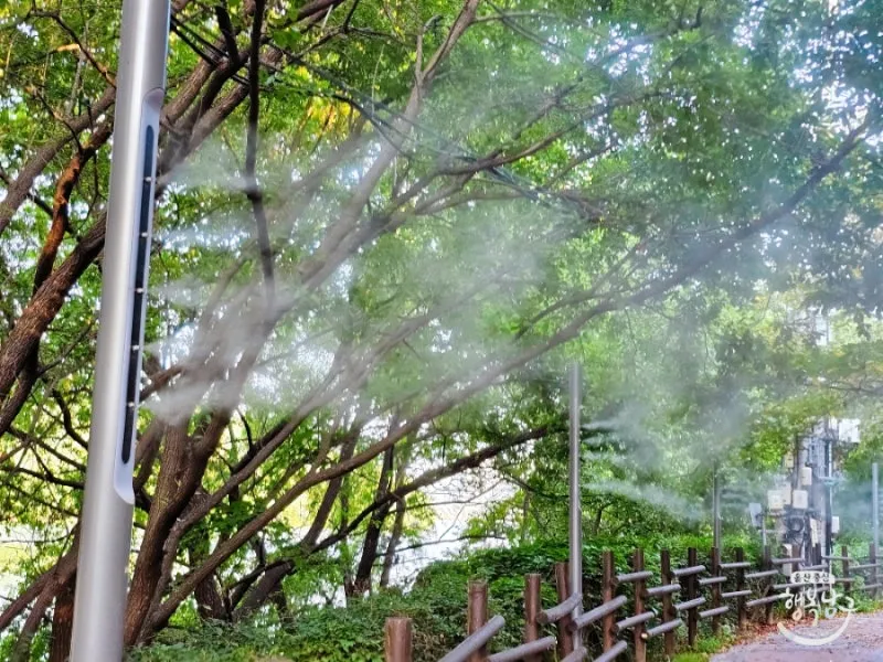 바로 쿨링 포그라는 설비인데 미세한 물안개를 분사해서 주변의 온도를 3~5°C 가량 낮춰주는 장치에요.