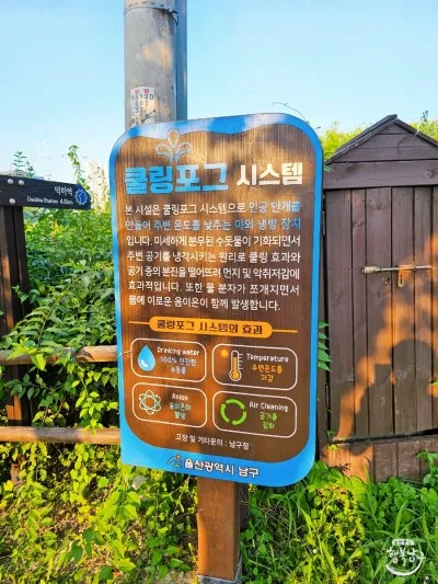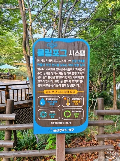 데크에서 호수를 따라 산책로를 걸으면 쿨링 포그 시스템에 대한 설명이 있는 안내판이 있습니다. 데크 앞, 산책로 끝에도 하나 있어요.