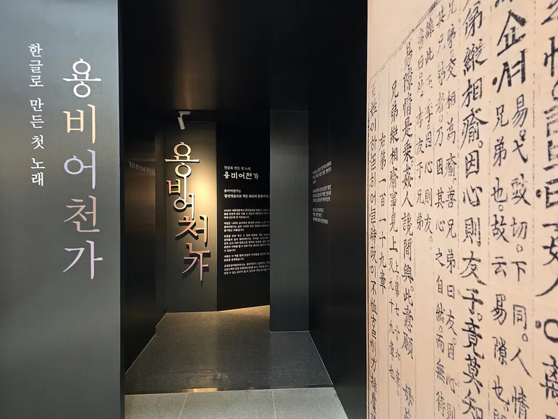 한글로 만든 첫 노래 용비어천가를 소개하는 공간도 따로 마련되어 있어요. 1447년 세종29년에 만들어진 용비어천가는 훈민정음 창제후 최초로 우리말 문장을 표기한 12장의 노래가사입니다. 집현전 학자들이 만든 것으로 조선 건국의 정당성과 임금이 갖추어야 할 덕목을 일러두고 있어요.