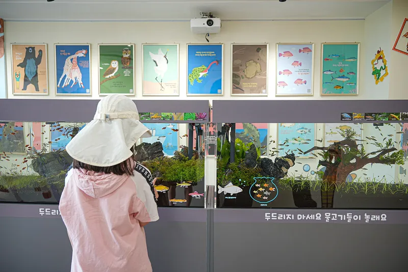 '명화로 만는 생태' 전시는 일러스트 그림감상과, 물고기를 만나고 실시간으로