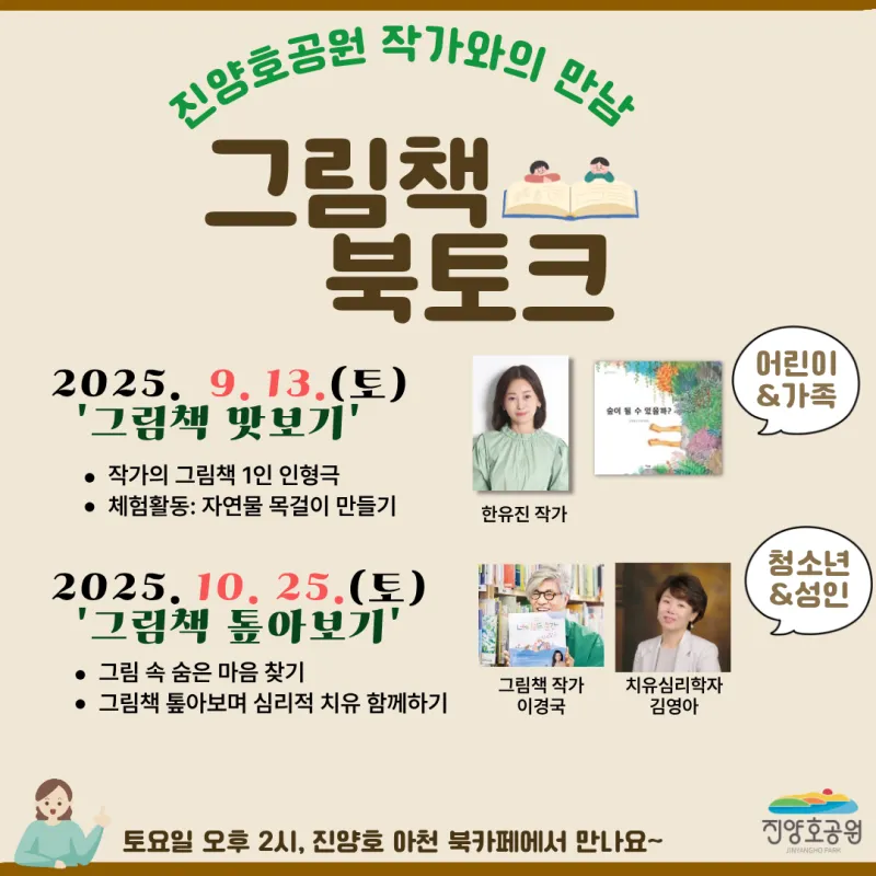 📚그림책 맛보기 : 체험&인형극 관람_한유진 작가 ✅ 일시 : 2025. 09. 13. (토)/ 14시~16시 (2시간) ✅ 장소 : 진양호 아천 북카페 (진양호 공원 내) ✅ 대상 : 만 5세 이상 어린이 동반 10~15가족 (30명 정도, 선착순 사전접수) ※ 어린이 : 행사 중 자리에 앉아 집중하며 체험활동이 가능한 어린이 ✅ 도서 : '숲이 될 수 있을까?' -한유진 글, 임덕란 그림 ✅ 주제 : 그림책 인형극과 함께하는 숲이야기 ✅ 참가비 : 무료 ✅ 신청기간 : 2025. 09. 01. (월) 오전 10시 ~ 09. 13. (토) ※ 선착순 마감으로 조기 종료 📚 그림책 톺아보기 : 심리 북토크_이경국 그림책 작가 & 김영아 치유상담사 ✅ 일시 : 2025. 10. 25. (토)/ 14시~16시 (2시간) ✅ 장소 : 진양호 아천 북카페 (진양호 공원 내) ✅ 대상 : 중1 이상 진주시민 30명 (선착순 사전접수) ✅ 도서 〰️ 「개꿈」 이경국, 페이퍼독, 2022 〰️ 「넌 없어!」 이경국, 페이퍼독, 2023 〰️ 「너의 모든 순간」 함께 그린 책, 로이북스, 2023 ✅ 주제 : '그림책 톺아보며 심리적 치유 함께하기' : 지금-여기 나를 토닥이는 힘 ✅ 참가비 : 무료 ✅ 신청기간 : 2025. 10. 13. (월) 오전 10시 ~ 10. 25. (토) ※ 선착순 마감으로 조기 종료 될 수 있음 ✅ 참가방법 : 네이버폼 통한 접수 ① 홈페이지 공지사항 (네이버 폼 링크 안내) ② 네이버폼 접수 (신청기간 내) ③ 접수 확인 문자 발송 ④ 프로그램 참여 📞 문의 : 진양호 공원 055-749-6965, 5961 |