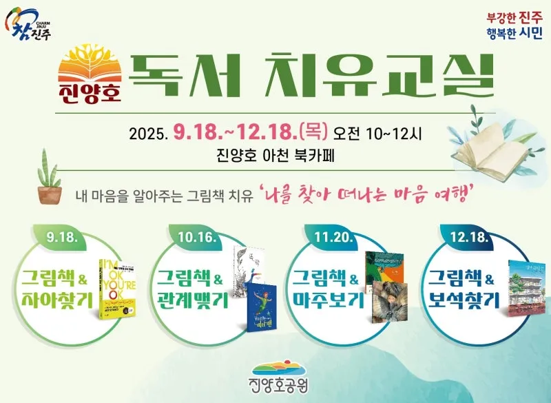 📖그림책으로 떠나는 마음여행 '진양호 독서 치유교실' ✅기간: 2025. 9. 18.(목) ~ 12. 18.(목), 매월 목요일 오전 10시 ~ 12시 ✅장소: 진양호 아천 북카페 ✅대상: 성인 시민 (회차별 선착순 20명 이내) ✅신청방법: 인터넷 플랫폼(네이버폼)을 이용한 온라인 신청 ✅문의: ☎ 055-749-5961, 6965 ✅세부일정: 1. 9월 18일(목) – 그림책 & 자아찾기 : 교류분석(TA)을 바탕으로 ‘나와 너의 자아’를 탐색 (사전신청 : 9. 3.(수) 오전 10시 선착순) 2. 10월 16일(목) – 그림책 & 관계맺기 : 그림책 속 등장인물의 이야기를 통해 관계 맺음, 행동 패턴 돌아보기 (사전신청 : 10. 1.(수) 오전 10시 선착순) 3. 11월 20일(목) – 그림책 & 마주보기: 그림책 이야기에서 발견하는 나의 스토리텔링 (사전신청 : 11. 5.(수) 오전 10시 선착순) 4. 12월 18일(목) – 그림책 & 보석찾기: 그림책으로 찾아보는 내 안의 숨은 보석(본질, 가치) 발견 (사전신청 : 12. 3.(수) 오전 10시 선착순) |