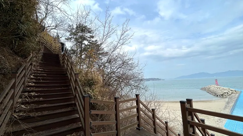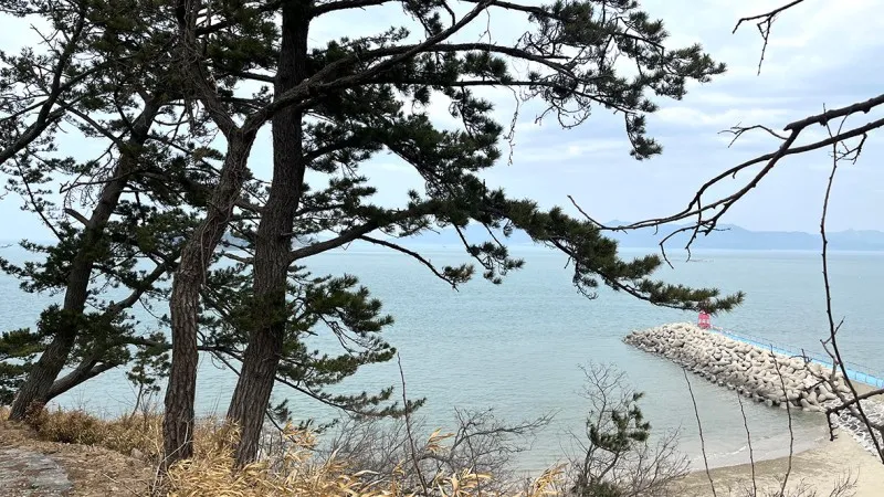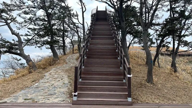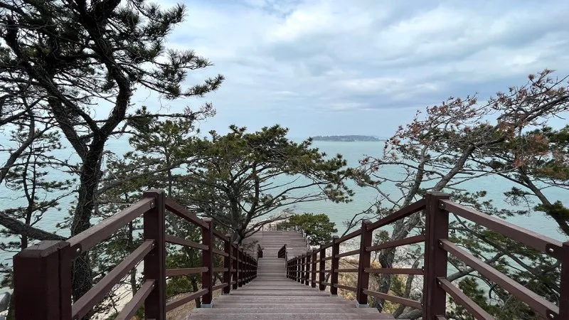 내려가면서 보니 더 높게 느껴집니다. 바다와 나무가 만드는 예술작품을 감상하며 즐거운 산책을 마무리합니다.