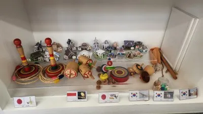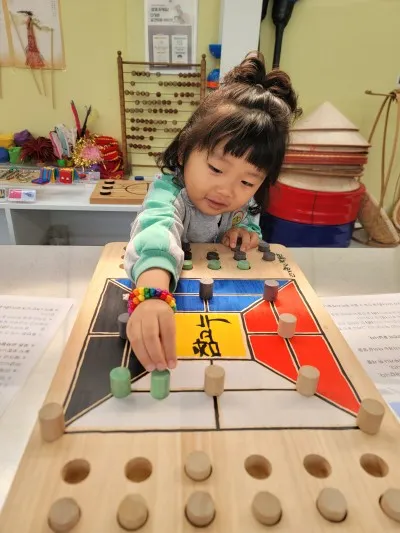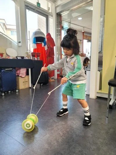 체험관에는 베트남의 코코넛 밟기, 일본의 캔다마와 스모 팽이, 중국의 타는 팽이, 콩주 등 각국의 놀이와 관련된 자료가 준비되어 있었습니다. 실제 놀이기구를 가지고 체험해 볼 수도 있었는데요, 재이는 제법 콩주를 가지고 놀더군요. 무대 위에서 팽이가 돌다 떨어지면 지는 스모팽이도 재미있게 가지고 놀았습니다.