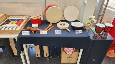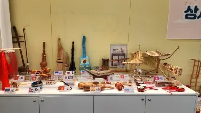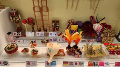 각 나라의 악기류도 모여 있었는데요. 등을 긁으면 소리가 나는 두꺼비 모양의 태국 전통악기와 실로폰과 비슷한 모양의 맑은 소리가 나는 악기, 두드려서 소리 내는 소고와 젬베도 있었습니다.