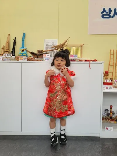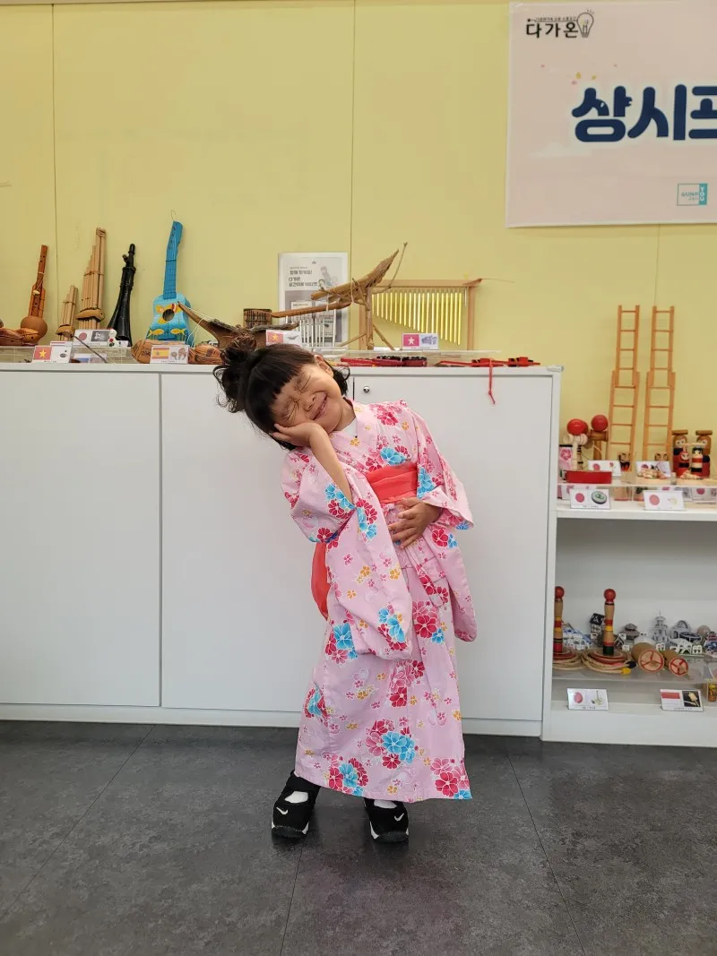 각 나라의 전통 의상이나 모자도 직접 착용해 볼 수 있었는데 산본에서 온 다섯 살 재이가 몸에 꼭 맞는 옷을 입으니 너무도 귀여운 모습이었습니다.