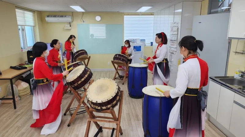 2층은 자조 모임 공간으로 소양 교육, 취미활동, 교육 활동이 이루어지는데 기자가 방문한 날에는 여섯 분이 모여 예쁜 의상을 차려입고 난타 연습에 비지땀을 흘리고 있었습니다.