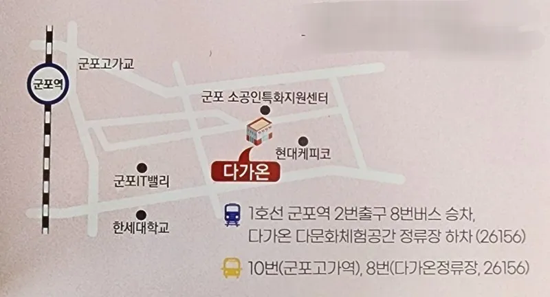 더불어 다문화 가족과의 화합을 위해서는 지역 주민분들의 많은 관심도 필요합니다. 자녀들과 함께 방문하시면 차이를 존중하고 협력하는 의미 있는 교육이 될 것입니다. 군포역에서 8번 버스를 타고 레인보우 정류장에서 하차하시면 바로 다가온(ON)에 방문하실 수 있으니 기회가 되신다면 꼭 찾아보시길 바랍니다.
