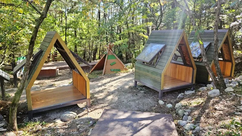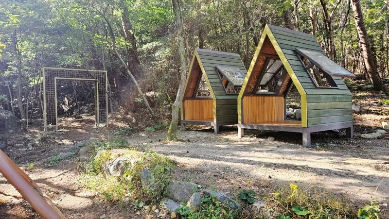 이 곳에는 어린이들을 위한 숲 체험 프로그램 장소로 활용할 수 있게 숲속집, 전망데크, 보행데크 및 다양한 벤치가 있습니다.
