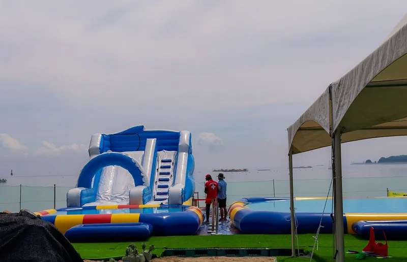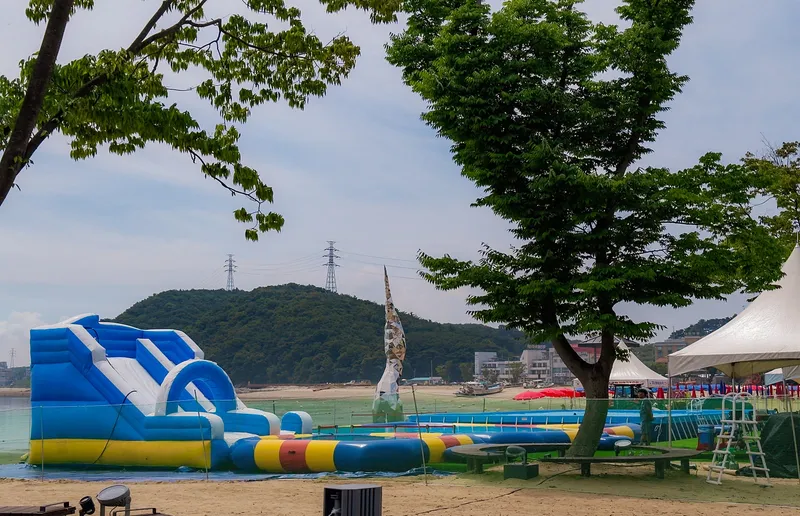 왜목마을해수욕장은 일반적인 바다 수영뿐 아니라 이색적인 물놀이를 즐길 수 있다는 점에서도 특별합니다. 해수욕장 한편에 마련된 에어바운스 물놀이장은 아이들에게 인기 만점이며, 물이 차오른 튜브 슬라이드나 놀이 기구에서 신나는 시간을 보낼 수 있습니다.