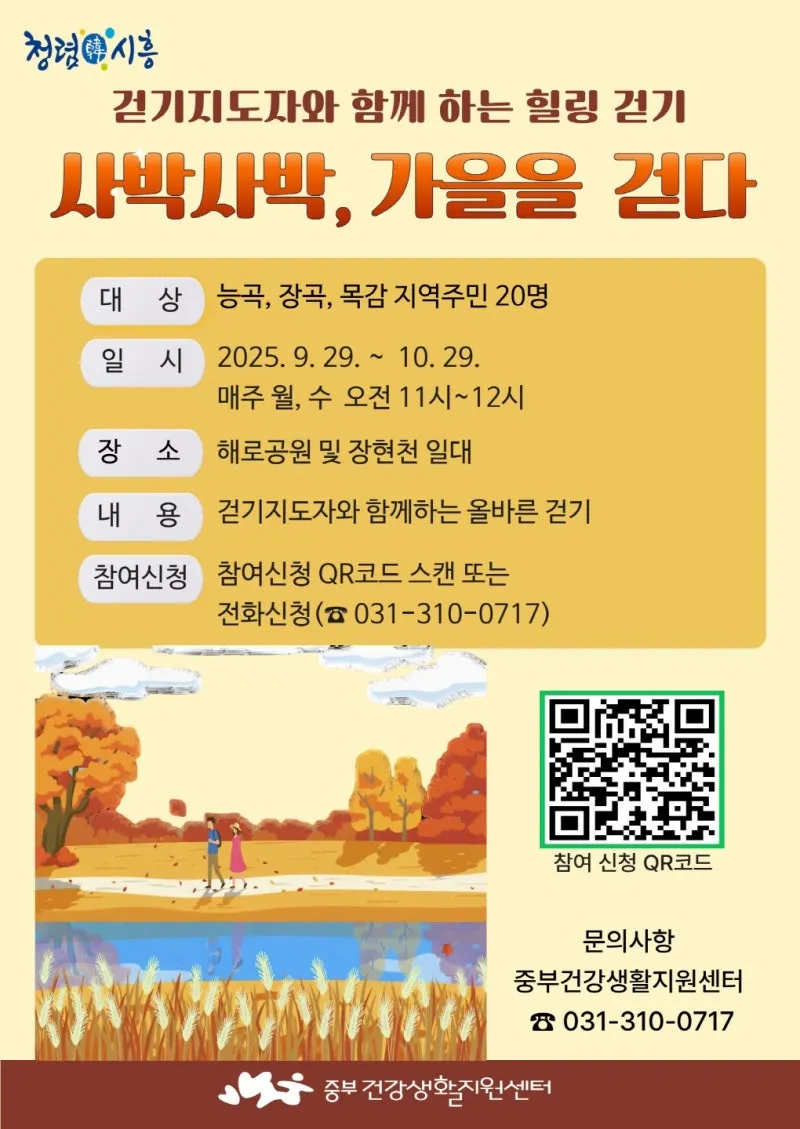 시흥시에서는 9월 29일부터 10월 29일까지 매주 월ㆍ수요일 오전 11시부터 12시 능곡동 해로공원 및 장현천 일대에서 ‘사박사박 가을을 걷다’ 프로그램을 운영합니다.