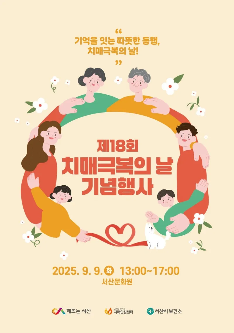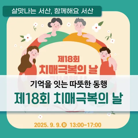 서산시, 제18회 치매 극복의 날 기념 캠페인 운영- 오는 9일 오후 1시부터 5시까지 치매 극복 홍보관 개최 -충남 서산시는 제18회 치매 극복의 날을 맞아 9월 22일까지 집중 캠페인을 추진한다고 2일 밝혔다. 2008년 지정, 운영되고 있는 치매 극복의 날은 치매 관리의 중요성을 알리고 치매를 극복하기 위한 범국민적 공감대를 형성하기 위해 세계 알츠하이머의 날과 같은 9월 21일로 지정됐다. 집중 캠페인은 ‘치매여도 안심할 수 있는 사회, 함께 사는 따뜻한 세상’을 주제로, 다양한 행사를 진행한다. 오는 9월 8일부터 21일까...