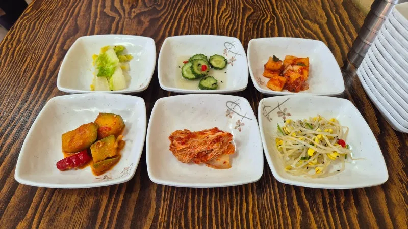 먼저 여섯가지의 반찬이 나오네요. 하얀 접시에 반찬이 깔끔하게 나오네요. 약간 매콤한 반찬과 맵지 않은 반찬이 함께 나와서 좋네요.